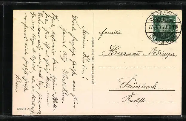 Personenbezogene Daten auf der Rückseite der Karte wurden durch blauen Textmarker unkenntlich gemacht. Die blauen Stellen sind auf die Vorderseite durchgeweicht und wirken sich negativ auf das Postkartenfoto aus