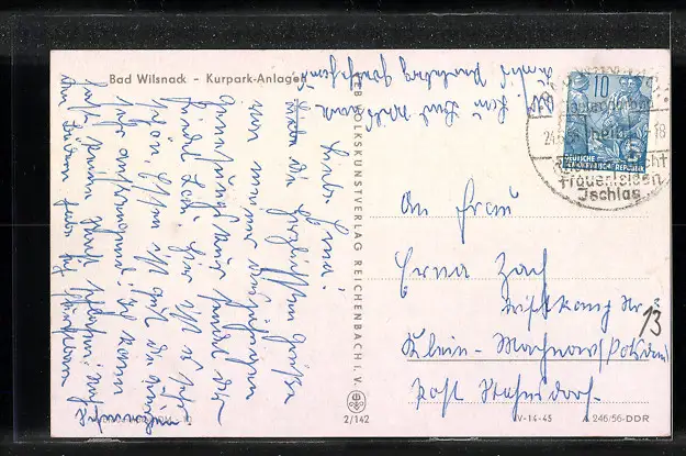 Personenbezogene Daten auf der Rückseite der Karte wurden durch blauen Textmarker unkenntlich gemacht. Die blauen Stellen sind auf die Vorderseite durchgeweicht und wirken sich negativ auf das Postkartenfoto aus