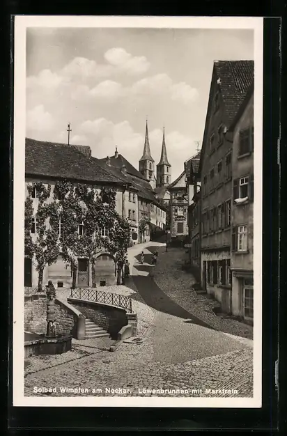AK Bad Wimpfen, Löwenbrunnen mit Marktrain, Kirche