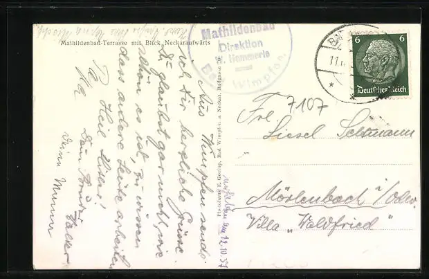 Personenbezogene Daten auf der Rückseite der Karte wurden durch blauen Textmarker unkenntlich gemacht. Die blauen Stellen sind auf die Vorderseite durchgeweicht und wirken sich negativ auf das Postkartenfoto aus