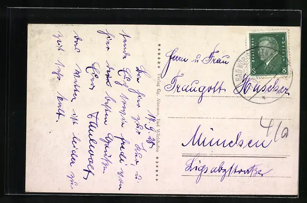 Personenbezogene Daten auf der Rückseite der Karte wurden durch blauen Textmarker unkenntlich gemacht. Die blauen Stellen sind auf die Vorderseite durchgeweicht und wirken sich negativ auf das Postkartenfoto aus