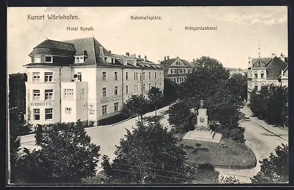 AK Bad Wörishofen, Strassenansicht mit Hotel Sproll mit Kriegerdenkmal