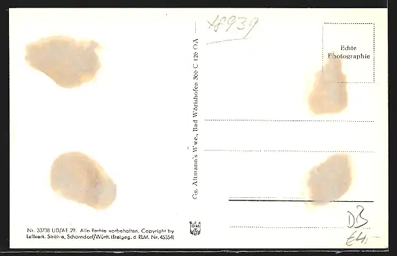 Personenbezogene Daten auf der Rückseite der Karte wurden durch blauen Textmarker unkenntlich gemacht. Die blauen Stellen sind auf die Vorderseite durchgeweicht und wirken sich negativ auf das Postkartenfoto aus