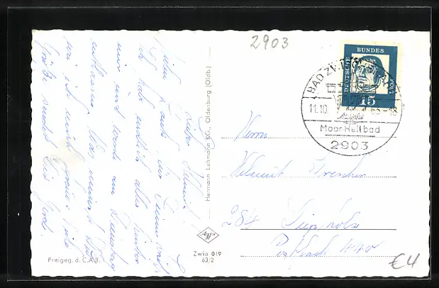 Personenbezogene Daten auf der Rückseite der Karte wurden durch blauen Textmarker unkenntlich gemacht. Die blauen Stellen sind auf die Vorderseite durchgeweicht und wirken sich negativ auf das Postkartenfoto aus