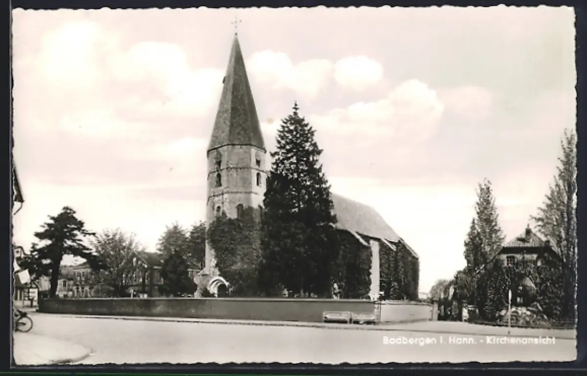 AK Badbergen i. Hann., Kirchenansicht mit Gartenanlage