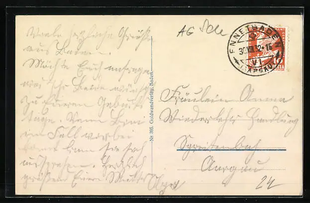 Personenbezogene Daten auf der Rückseite der Karte wurden durch blauen Textmarker unkenntlich gemacht. Die blauen Stellen sind auf die Vorderseite durchgeweicht und wirken sich negativ auf das Postkartenfoto aus