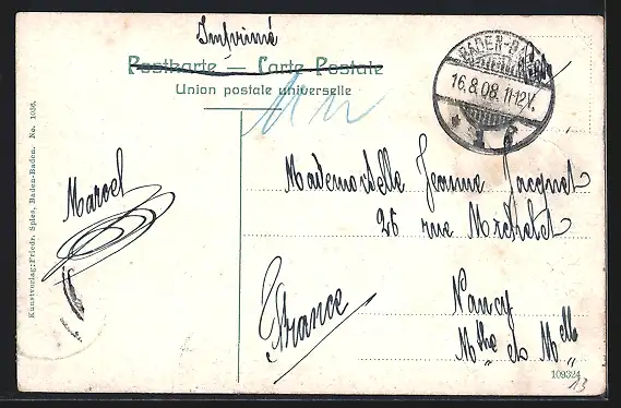 alte Ansichtskarte, gelaufen 1908, Briefmarke entfernt, guter Zustand
