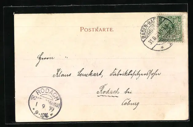 alte Ansichtskarte, gelaufen 1899, guter Zustand