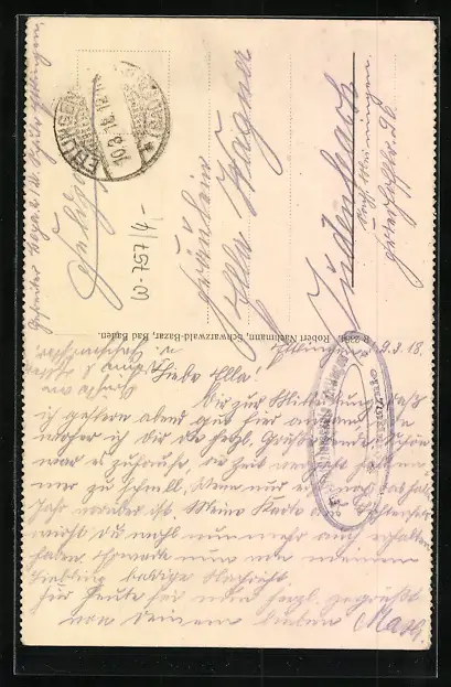 Personenbezogene Daten auf der Rückseite der Karte wurden durch blauen Textmarker unkenntlich gemacht. Die blauen Stellen sind auf die Vorderseite durchgeweicht und wirken sich negativ auf das Postkartenfoto aus