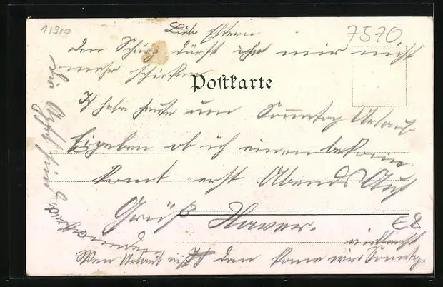 Personenbezogene Daten auf der Rückseite der Karte wurden durch blauen Textmarker unkenntlich gemacht. Die blauen Stellen sind auf die Vorderseite durchgeweicht und wirken sich negativ auf das Postkartenfoto aus