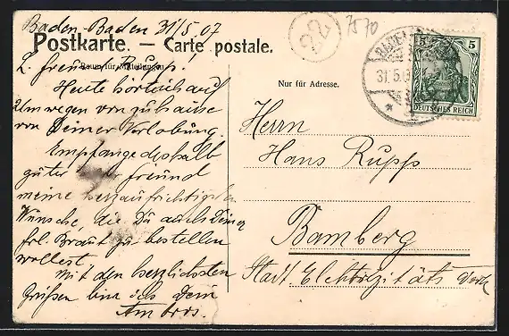 alte Ansichtskarte, gelaufen 1907, Eckknicke re. und unten li., Einriss unten mittig