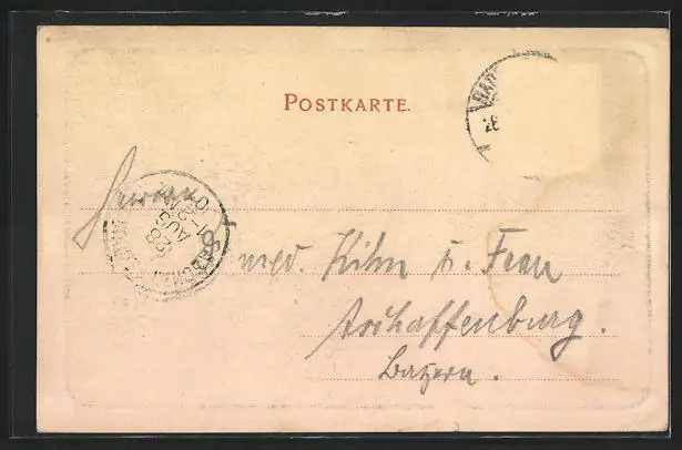 Personenbezogene Daten auf der Rückseite der Karte wurden durch blauen Textmarker unkenntlich gemacht. Die blauen Stellen sind auf die Vorderseite durchgeweicht und wirken sich negativ auf das Postkartenfoto aus