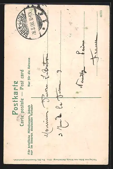 alte Ansichtskarte, gelaufen 1908, Eckknick oben li., Stempelspur, guter Zustand