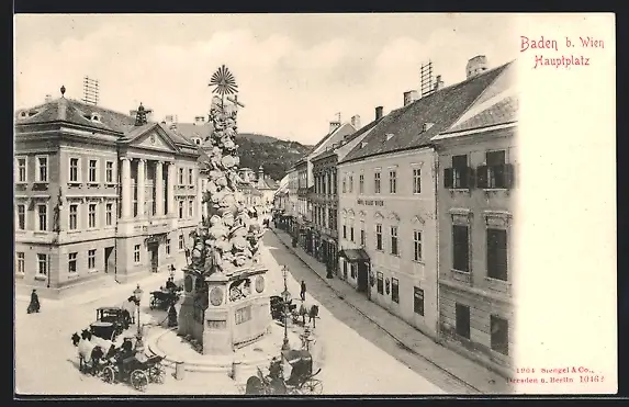 AK Baden, Hauptplatz mit Hotel Stadt Wien mit Denkmal