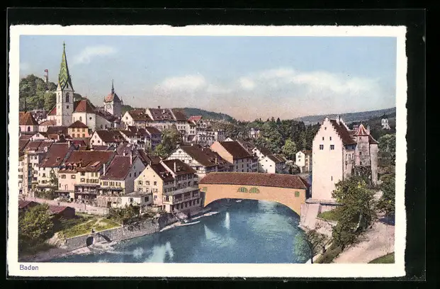 AK Baden, Ortsansicht mit Brücke und Kirche
