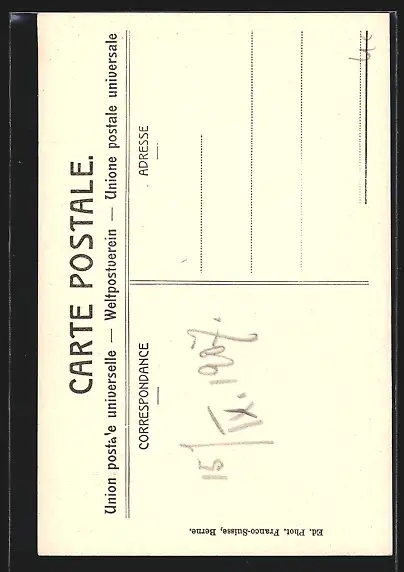 Personenbezogene Daten auf der Rückseite der Karte wurden durch blauen Textmarker unkenntlich gemacht. Die blauen Stellen sind auf die Vorderseite durchgeweicht und wirken sich negativ auf das Postkartenfoto aus