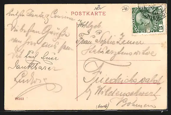Personenbezogene Daten auf der Rückseite der Karte wurden durch blauen Textmarker unkenntlich gemacht. Die blauen Stellen sind auf die Vorderseite durchgeweicht und wirken sich negativ auf das Postkartenfoto aus