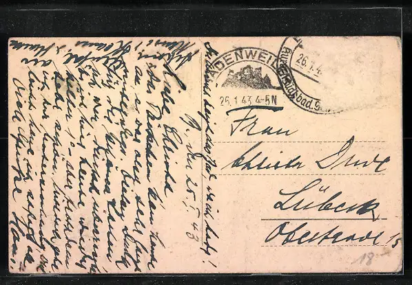 alte Ansichtskarte, gelaufen 1943, Briefmarke entfernt, rückseitig Oberflächenschaden, Bugspuren oben