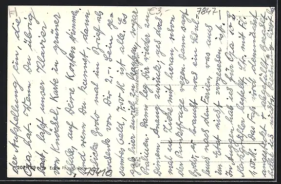 Personenbezogene Daten auf der Rückseite der Karte wurden durch blauen Textmarker unkenntlich gemacht. Die blauen Stellen sind auf die Vorderseite durchgeweicht und wirken sich negativ auf das Postkartenfoto aus