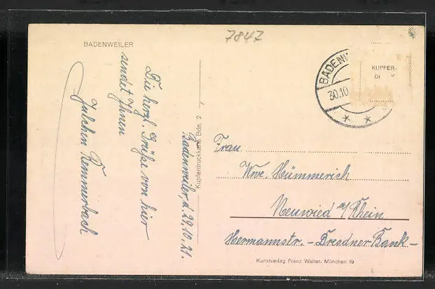Personenbezogene Daten auf der Rückseite der Karte wurden durch blauen Textmarker unkenntlich gemacht. Die blauen Stellen sind auf die Vorderseite durchgeweicht und wirken sich negativ auf das Postkartenfoto aus