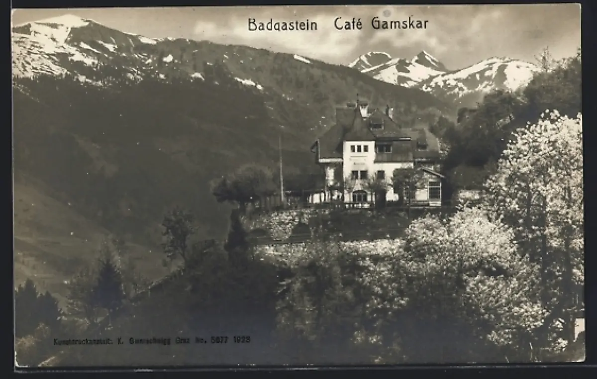 AK Badgastein, Café Gamskar mit Bergpanorama