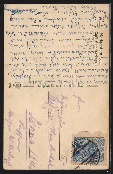 Personenbezogene Daten auf der Rückseite der Karte wurden durch blauen Textmarker unkenntlich gemacht. Die blauen Stellen sind auf die Vorderseite durchgeweicht und wirken sich negativ auf das Postkartenfoto aus