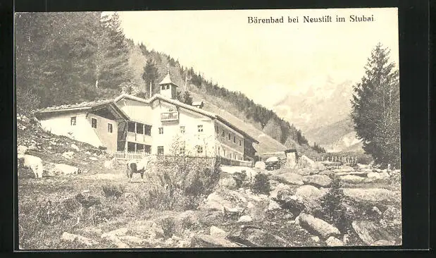 AK Bärenbad bei Neustift, Ortsansicht mit Haus und Alpen