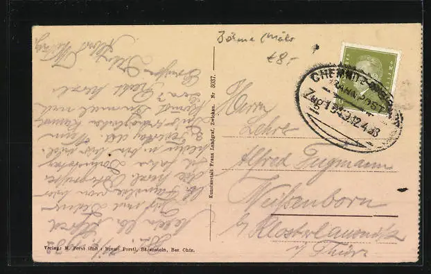 Personenbezogene Daten auf der Rückseite der Karte wurden durch blauen Textmarker unkenntlich gemacht. Die blauen Stellen sind auf die Vorderseite durchgeweicht und wirken sich negativ auf das Postkartenfoto aus