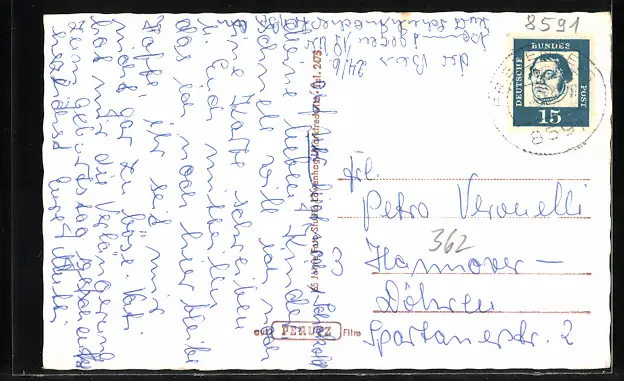 Personenbezogene Daten auf der Rückseite der Karte wurden durch blauen Textmarker unkenntlich gemacht. Die blauen Stellen sind auf die Vorderseite durchgeweicht und wirken sich negativ auf das Postkartenfoto aus