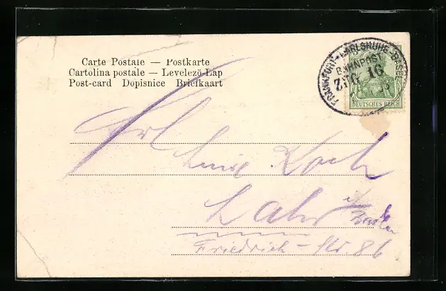 Personenbezogene Daten auf der Rückseite der Karte wurden durch blauen Textmarker unkenntlich gemacht. Die blauen Stellen sind auf die Vorderseite durchgeweicht und wirken sich negativ auf das Postkartenfoto aus