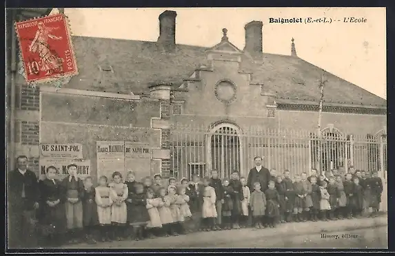 AK Baignolet, L`école avec des élèves et un enseignant devant le bâtiment scolaire