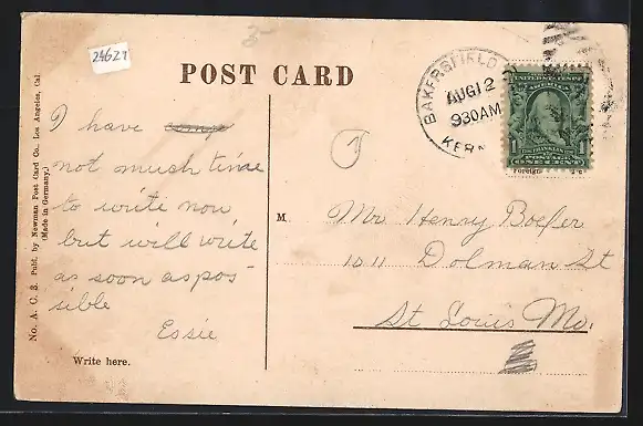 Personenbezogene Daten auf der Rückseite der Karte wurden durch blauen Textmarker unkenntlich gemacht. Die blauen Stellen sind auf die Vorderseite durchgeweicht und wirken sich negativ auf das Postkartenfoto aus