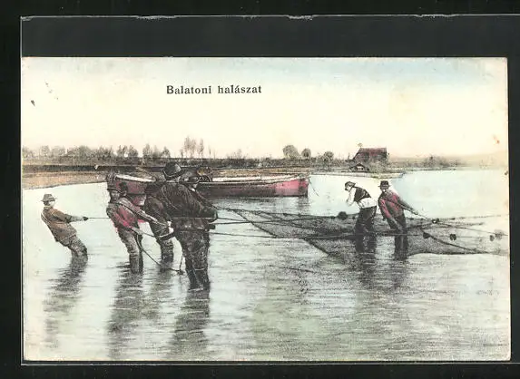 AK Balatoni halaszat, Fischer mit Netzen und Boot