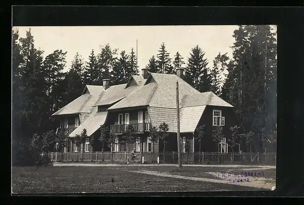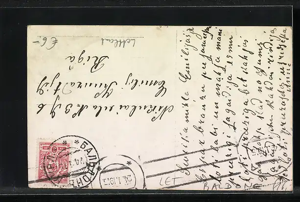 Personenbezogene Daten auf der Rückseite der Karte wurden durch blauen Textmarker unkenntlich gemacht. Die blauen Stellen sind auf die Vorderseite durchgeweicht und wirken sich negativ auf das Postkartenfoto aus
