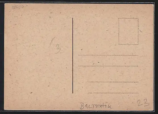 Personenbezogene Daten auf der Rückseite der Karte wurden durch blauen Textmarker unkenntlich gemacht. Die blauen Stellen sind auf die Vorderseite durchgeweicht und wirken sich negativ auf das Postkartenfoto aus
