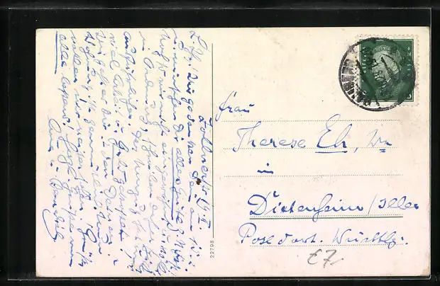 Personenbezogene Daten auf der Rückseite der Karte wurden durch blauen Textmarker unkenntlich gemacht. Die blauen Stellen sind auf die Vorderseite durchgeweicht und wirken sich negativ auf das Postkartenfoto aus