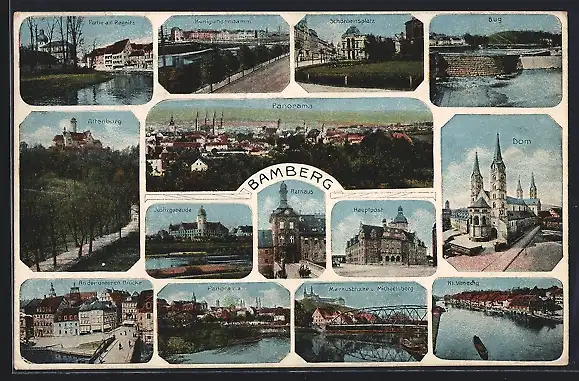 AK Bamberg, Panorama, Hauptpost, Justizgebäude, Dom