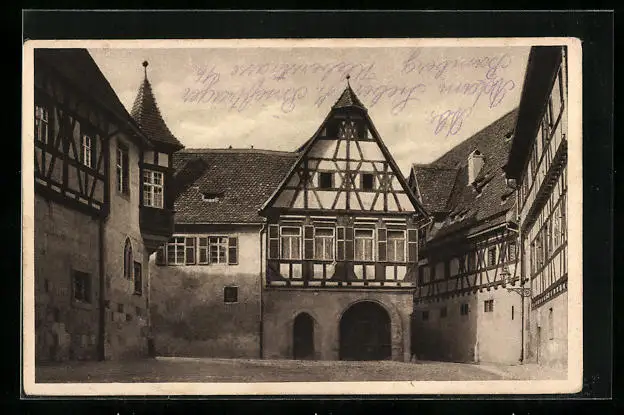 Personenbezogene Daten auf der Rückseite der Karte wurden durch blauen Textmarker unkenntlich gemacht. Die blauen Stellen sind auf die Vorderseite durchgeweicht und wirken sich negativ auf das Postkartenfoto aus