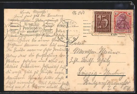 Personenbezogene Daten auf der Rückseite der Karte wurden durch blauen Textmarker unkenntlich gemacht. Die blauen Stellen sind auf die Vorderseite durchgeweicht und wirken sich negativ auf das Postkartenfoto aus
