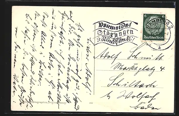 Personenbezogene Daten auf der Rückseite der Karte wurden durch blauen Textmarker unkenntlich gemacht. Die blauen Stellen sind auf die Vorderseite durchgeweicht und wirken sich negativ auf das Postkartenfoto aus