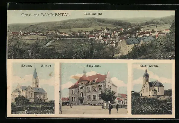 AK Bammental, Schulhaus, Kirchen, Totalansicht aus der Vogelschau