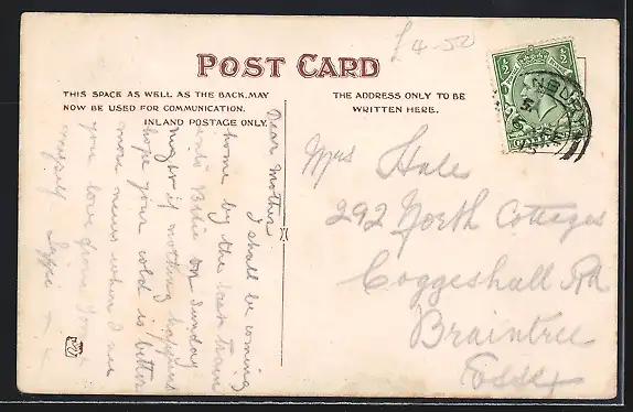 Personenbezogene Daten auf der Rückseite der Karte wurden durch blauen Textmarker unkenntlich gemacht. Die blauen Stellen sind auf die Vorderseite durchgeweicht und wirken sich negativ auf das Postkartenfoto aus