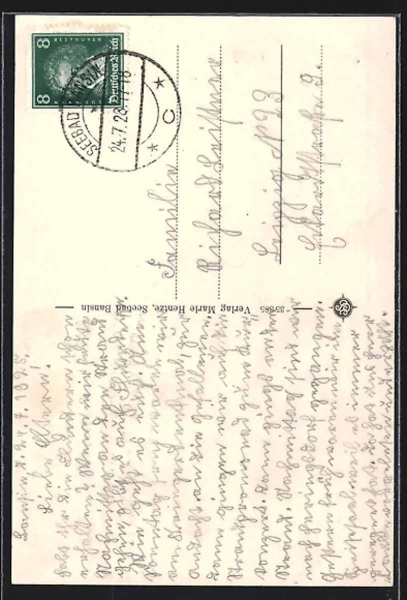Personenbezogene Daten auf der Rückseite der Karte wurden durch blauen Textmarker unkenntlich gemacht. Die blauen Stellen sind auf die Vorderseite durchgeweicht und wirken sich negativ auf das Postkartenfoto aus