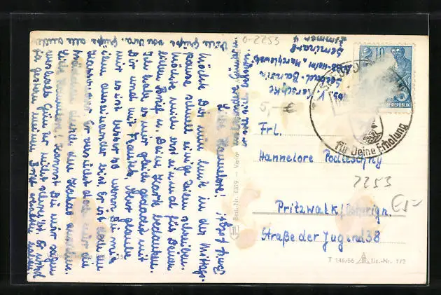 Personenbezogene Daten auf der Rückseite der Karte wurden durch blauen Textmarker unkenntlich gemacht. Die blauen Stellen sind auf die Vorderseite durchgeweicht und wirken sich negativ auf das Postkartenfoto aus