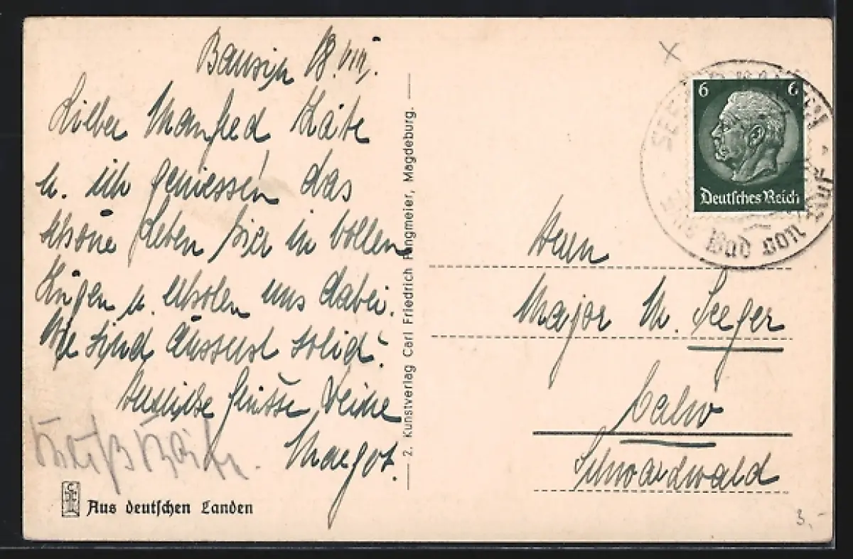 Personenbezogene Daten auf der Rückseite der Karte wurden durch blauen Textmarker unkenntlich gemacht. Die blauen Stellen sind auf die Vorderseite durchgeweicht und wirken sich negativ auf das Postkartenfoto aus