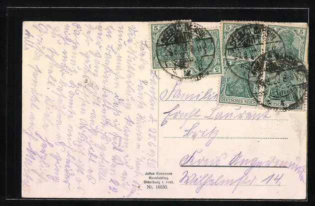 Personenbezogene Daten auf der Rückseite der Karte wurden durch blauen Textmarker unkenntlich gemacht. Die blauen Stellen sind auf die Vorderseite durchgeweicht und wirken sich negativ auf das Postkartenfoto aus