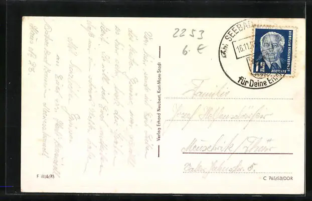 Personenbezogene Daten auf der Rückseite der Karte wurden durch blauen Textmarker unkenntlich gemacht. Die blauen Stellen sind auf die Vorderseite durchgeweicht und wirken sich negativ auf das Postkartenfoto aus