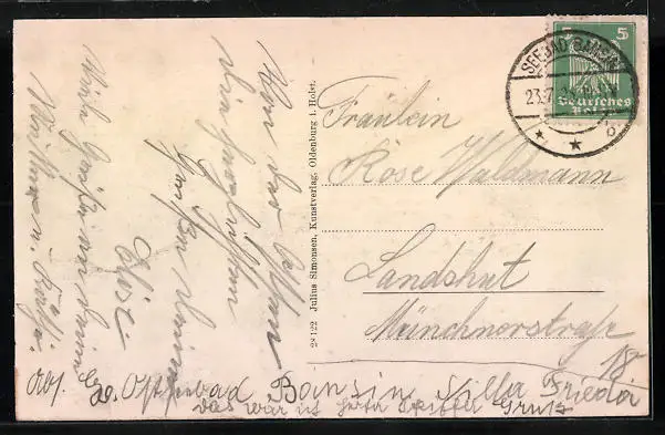Personenbezogene Daten auf der Rückseite der Karte wurden durch blauen Textmarker unkenntlich gemacht. Die blauen Stellen sind auf die Vorderseite durchgeweicht und wirken sich negativ auf das Postkartenfoto aus