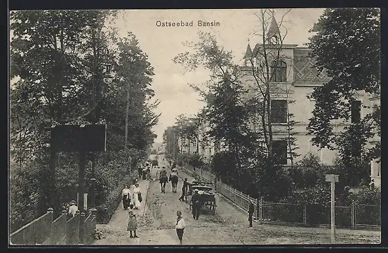 AK Bansin, Strassenpartie mit Kutsche und Reitern