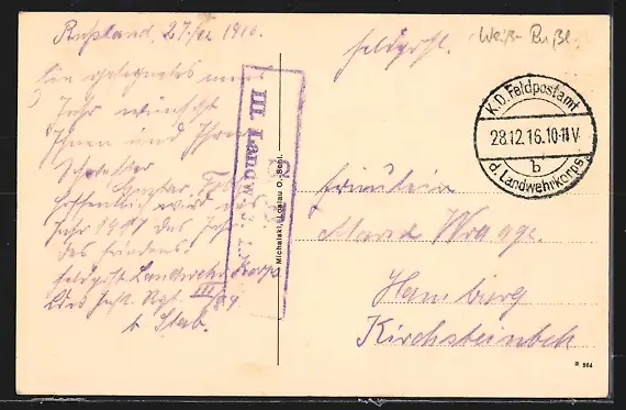 Personenbezogene Daten auf der Rückseite der Karte wurden durch blauen Textmarker unkenntlich gemacht. Die blauen Stellen sind auf die Vorderseite durchgeweicht und wirken sich negativ auf das Postkartenfoto aus